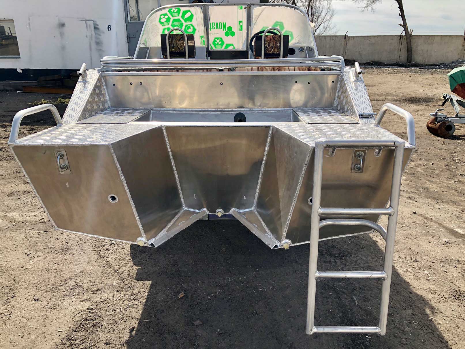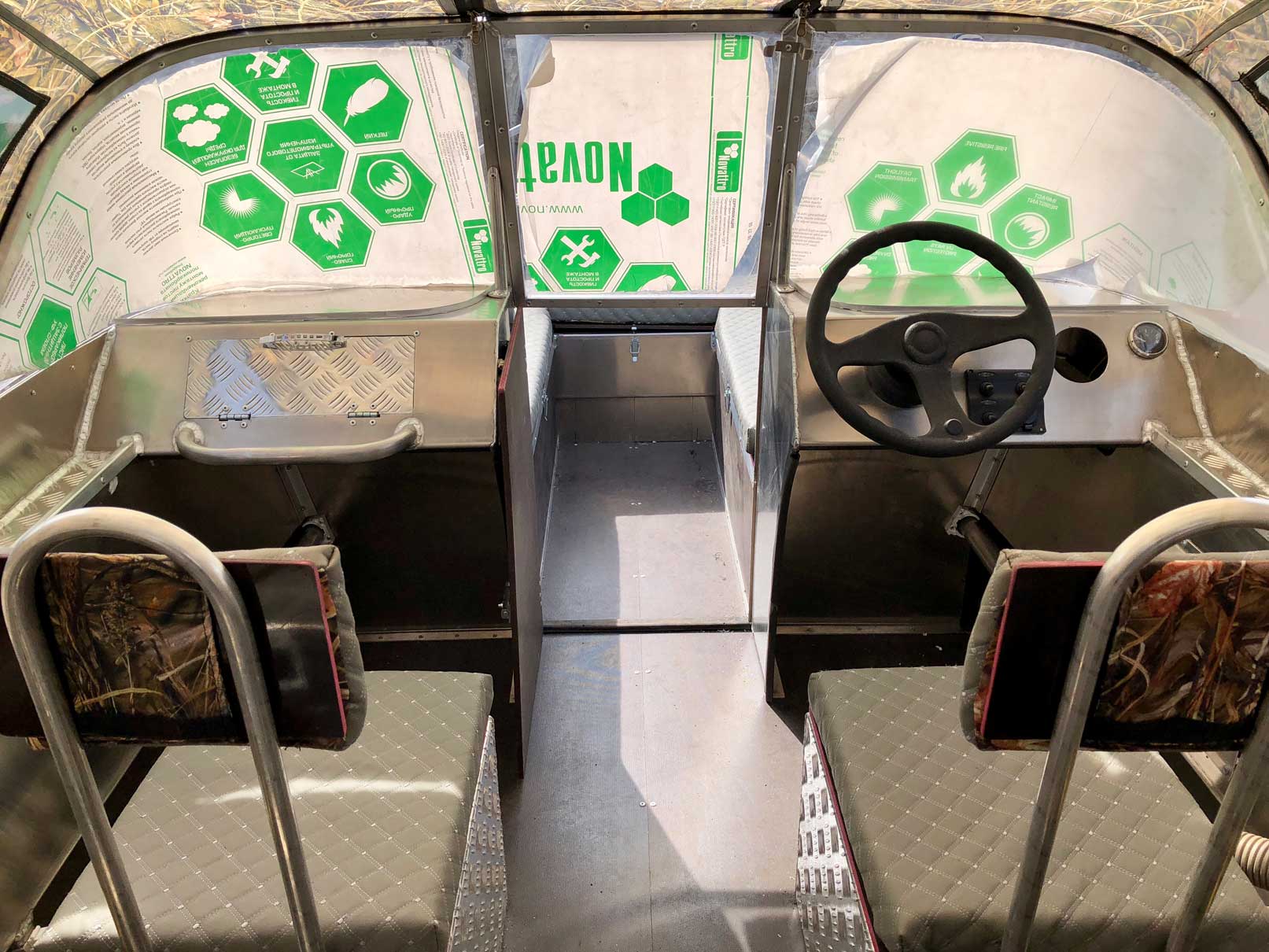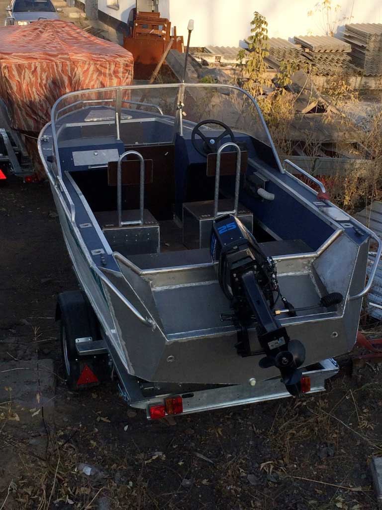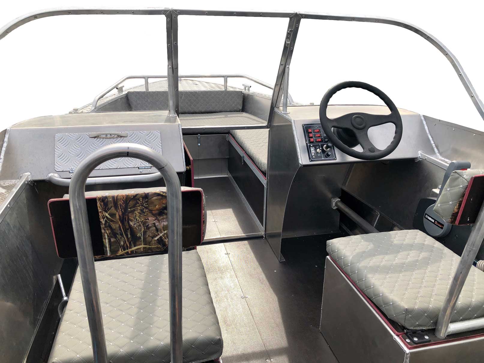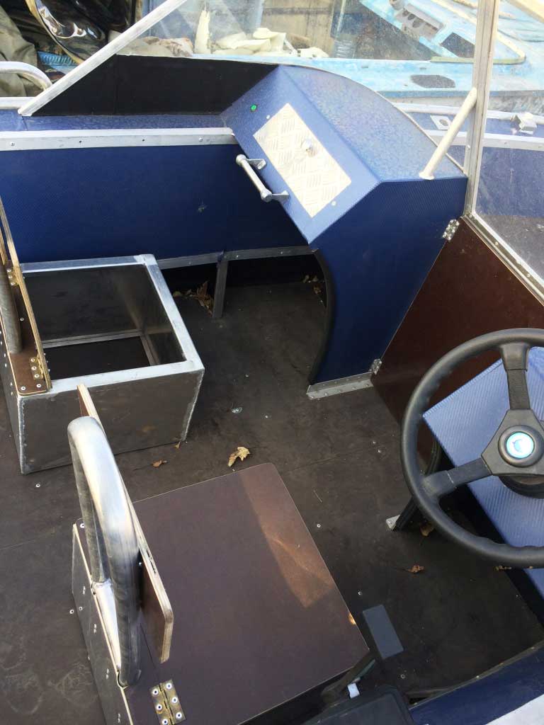 - Алюминиевая панель управления катером состоящая из двух консолей, в комплекте (рулевой редуктор, штурвал, рулевой трос, дверца прохода в носовой кокпит)