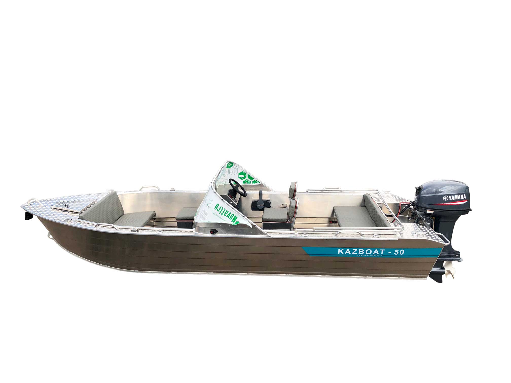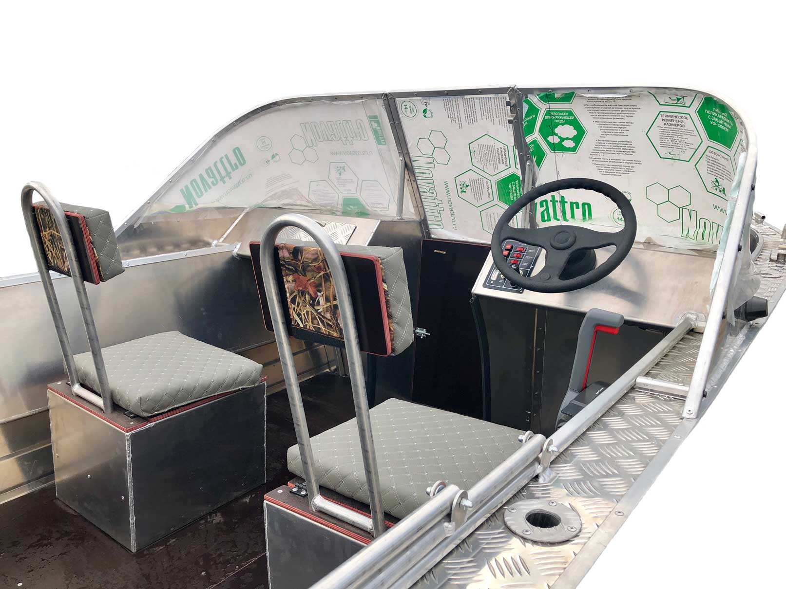 - Алюминиевая панель управления катером состоящая из двух консолей, в комплекте (рулевой редуктор, штурвал, рулевой трос, дверца прохода в носовой кокпит)